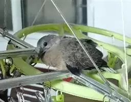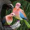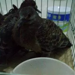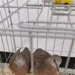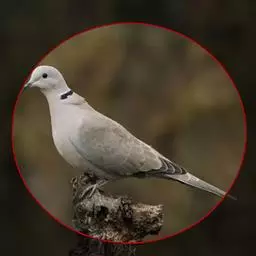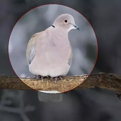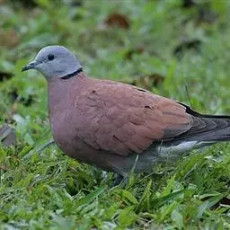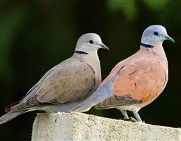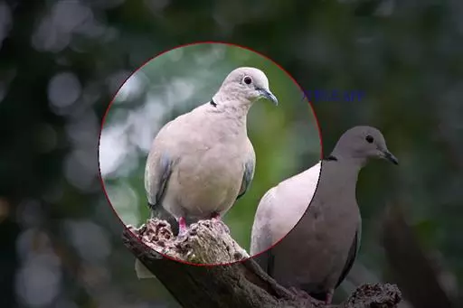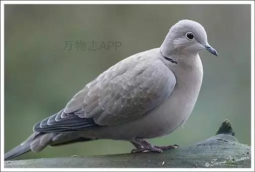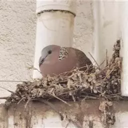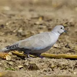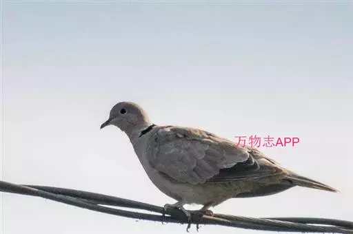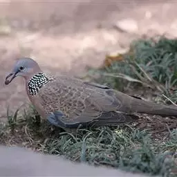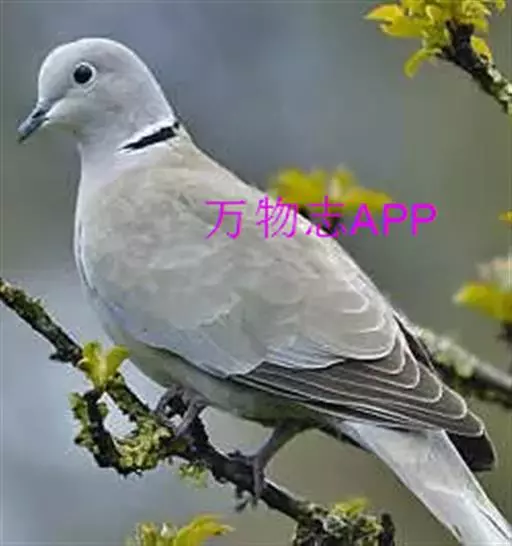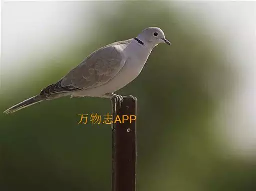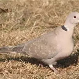 灰斑鸠(学名:Streptopelia decaocto):其全身灰褐色,翅膀上有蓝灰色斑块,尾羽尖端为白色,颈后有黑色颈环,环外有白色羽毛围绕。虹膜红色,眼睑也为红色,眼周裸露皮肤自包或浅灰色,嘴近黑色,脚和趾暗粉红色。