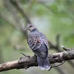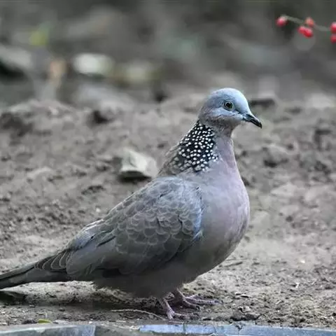 山斑鸠,是鸽形目鸽鸠科斑鸠属鸟类,又名金背斑鸠、棕背斑鸠、山鸠、金背鸠、麒麟斑、麒麟鸠、东方斑鸠、绿斑鸠、山鸽子。山斑鸠颈侧具明显黑白色条纹的块状斑,上体深褐色、具扇贝状斑纹,羽缘棕色,尾羽近黑色,下体多偏粉色。虹膜黄色,喙灰色,脚粉色。山斑鸠是留鸟,在中国常见且分布广泛。此外,还分布于不丹、尼泊尔、巴基斯坦、印度、日本等国。栖息于针阔混交林、季风常绿阔叶林、果园及农耕区,多成对活动于开阔农耕区、村舍、寺院周围及防火林带。取食于地面,主要觅食植物种子、果实、嫩芽等,也吃昆虫。山斑鸠飞翔时鼓翼快速,叫声为反复而低沉的“咕咕咕”声。繁殖期在4-7月,营巢于林中树上,通常一年繁殖2窝,窝卵数2枚,由雌雄亲鸟轮流孵卵,孵化期18~19天。山斑鸠的肉、卵可食,肉入药可益气明目、强筋壮骨,治久病气虚、衰弱无力、两目昏暗等病症。山斑鸠啄食杂草种子,对农田清除杂草有益;但有时也刨食农作物及树的种子。山斑鸠