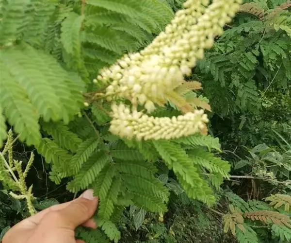 多为小叶。完整的叶为二回羽状复叶,羽片20-28个,每羽片有小叶20-30片,皱缩。湿润展平后小叶片椭圆形,微偏斜,长约1cm,宽3-4mm,先端钝圆而微凹,基部斜圆形,全缘,主脉明显。绿色或枯绿色。质脆,气微。