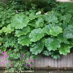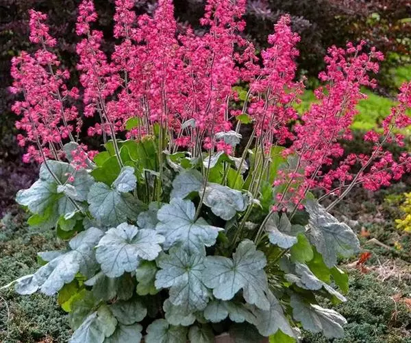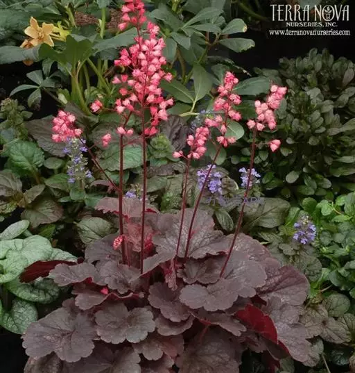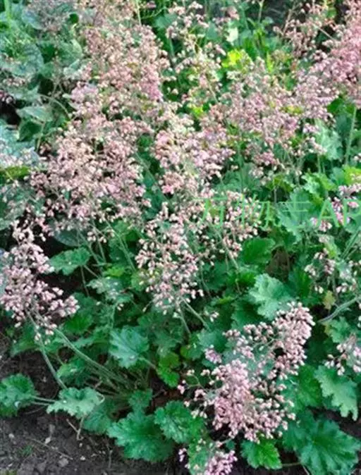 多年生耐寒草本,高度10-50cm,浅根性。叶近圆形,缘具圆齿,阔心形,长20-25cm,深绿色,在温暖地区冬季常绿。花小钟状,径约0.6-1.2cm,红色,两侧对称,小花着生在总花便上形成圆锥花序,高出叶丛,雄蕊5枚,萼片长于花瓣,小花粉红色,分裂,花期5-6月。本种与其它一些原产北美种杂交选育出许多园艺品种,有白、粉、粉红、红色、大花等品种。