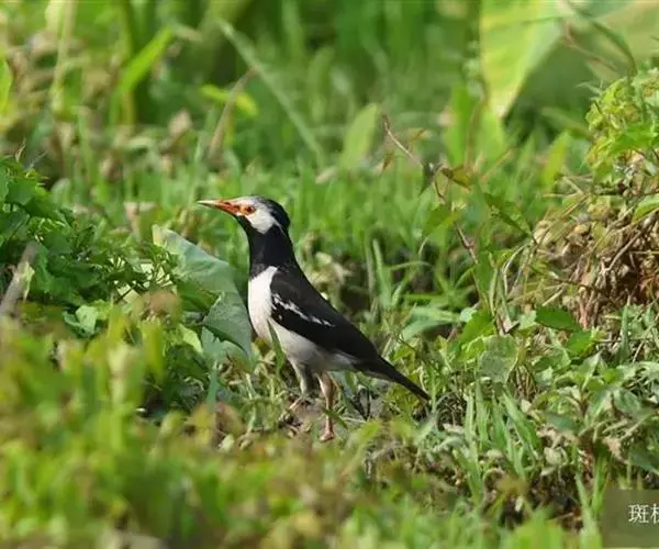 斑椋鸟:是中等体型的黑白色椋鸟,体长24厘米。头顶、头侧、翼斑、腰及腹部白色,喉、胸及上体余部黑色,…