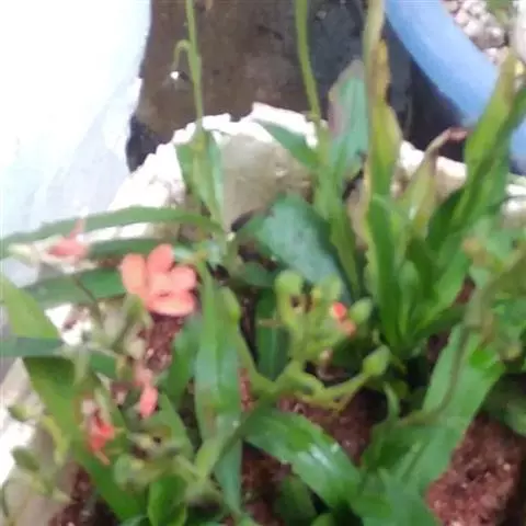 花葶长达38厘米;总状花序疏生4-9朵花;花序柄被3枚鞘;花苞片狭披针形,约等长于花梗和子房,通常长1-1.5厘米,先端渐尖;萼片和花瓣绿色,先端内面具红色斑点;中萼片狭长圆状披针形,长15-17毫米,宽2.2-2.5毫米,先端渐尖,具3条脉;侧萼片镰刀状倒披针形,比中萼片稍短而宽,先端渐尖,基部贴生于蕊柱足,具3条脉。