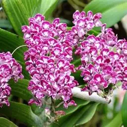 紫花苞舌兰:植株高达1米。假鳞茎卵状圆锥形,具3-5枚叶。叶质地薄,淡绿色,狭长,具折扇状的脉。…