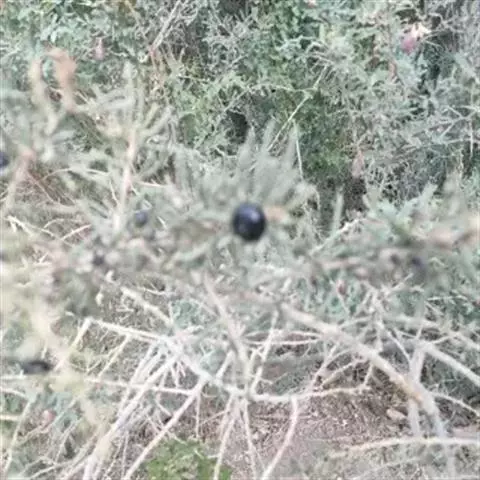 黑果枸杞 多棘刺灌木,高20-50(-150)厘米,多分枝;分枝斜升或横卧于地面,白色或灰白色,坚硬,常成之字形曲折,有不规则的纵条纹,小枝顶端渐尖成棘刺状,节间短缩,每节有长0.3-1.5厘米的短棘刺;短枝位于棘刺两侧,在幼枝上不明显,在老枝上则成瘤状,生有簇生叶或花、叶同时簇生,更老的枝则短枝成不生叶的瘤状凸起。叶2-6枚簇生于短枝上,在幼枝上则单叶互生,肥厚肉质,近无柄,条形、条状披针形或条状倒披针形,有时成狭披针形,顶端钝圆,基部渐狭,两侧有时稍向下卷,中脉不明显,长0.5-3厘米,宽2-7毫米。