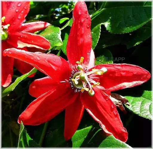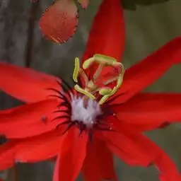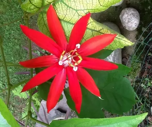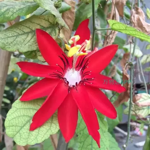 红花西番莲(Passiflora coccinea Aubl.) ,又名洋红西番莲,是西番莲科,西番莲属 的多年生常绿蔓性藤本植物,蔓长可达数米。幼茎近圆形,老茎三棱形。叶互生,长卵形。花单生于叶腋,花瓣长披针形,先端微急尖,稍外向下垂,红色。副花冠3轮,最外轮较长,紫褐色并散布有斑点状白色,内两轮为白色。果卵圆形。