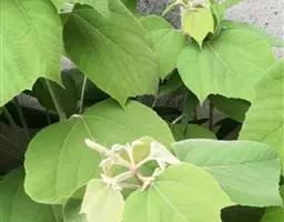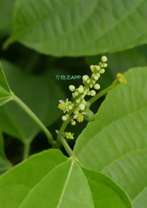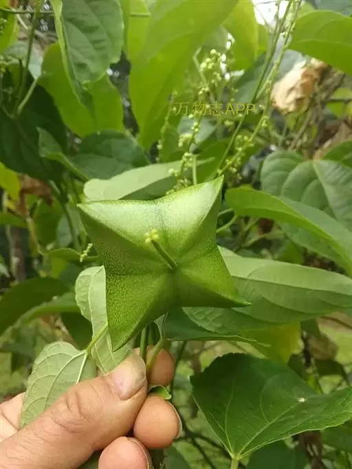 多年生木质藤本植物,长可达3米以上。叶互生,具柄,卵圆形至卵状长圆形,具基出三脉,两面无毛,边缘有锯齿。圆锥花序近似总状,腋生;花单性;雄花多数,生于花序上部,花小,黄白色;雄花1-2朵生于花序下部,花被不明显,花柱粗壮,线形。蒴果星状,具4-6个果瓣,幼时表面光滑、绿色,成熟时茶锅色,每个果瓣内含有1粒种子。花果期几全年。