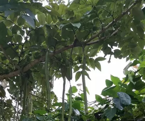 荚果圆柱形,长30-60厘米,直径2-2.5厘米,黑褐色,不开裂,有3条槽纹;种子40-100颗,为横隔膜所分开。花期6-8月;果期10月。