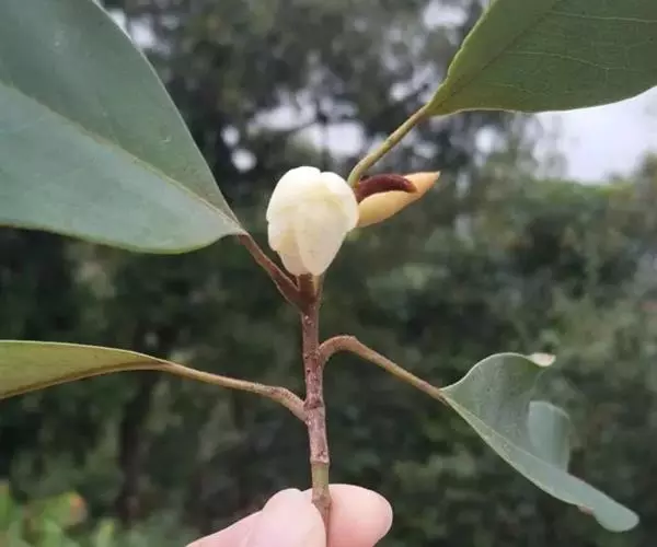 花蕾内有时包裹不同节上2-3小花蕾,形成2-3朵的聚伞花序,花梗直径3-4毫米,长1-1.3厘米,具2-3苞片脱落痕,花被片白色,通常9片,匙状倒卵形或倒披针形,长3-5厘米,内面的较狭小;雄蕊长1-2厘米,花药长0.8-1.4厘米,药隔伸出成1毫米的短尖头,花丝红色,长约1毫米;雌蕊群长1.4-2厘米,雌蕊群柄长1-2厘米,密被褐色短绒毛;心皮卵圆形或狭卵圆形、长4-5毫米。