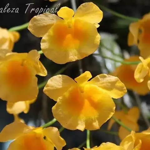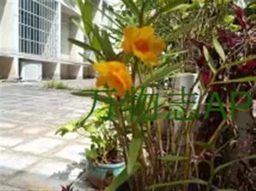 独角石斛,Dendrobium unicum,兰科石斛属植物。花瓣橙黄色,唇瓣反转似犀牛角,…