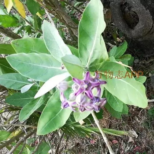 牛角瓜(学名:Calotropis gigantea (L.) Dry.ex Ait.f.)是直立灌木,高达3米,全株具乳汁;茎黄白色,枝粗壮,幼枝部分被灰白色绒毛。叶倒卵状长圆形或椭圆状长圆形,长8-20厘米,宽3.5-9.5厘米。聚伞花序伞形状,腋生和顶生;花序梗和花梗被灰白色绒毛。蓇葖单生;种子广卵形,长5毫米,宽3毫米;种毛长2.5厘米。花果期几乎全年。