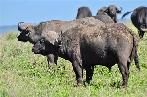 非洲野水牛(学名:Syncerus caffer):共有5个亚种。头体长2.1-3.4米,身高1-1.7米,体重300-900千克。胸膛宽阔,四肢粗壮,头大角长,雄性的角从头部向外和向下扩散,在一些雄性中,角通过覆盖头部的大盾连接。头顶的柔软的毛发附着在大而下垂的耳朵上。身体通常覆盖着稀疏的毛发,通常从棕色到黑色。长尾巴,尾尖处有毛发流苏。雄性个体大于雌性,角也更大更长更厚。而热带草原的种群的体型可以达到森林栖息地的物种的两倍。