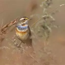 日本歌鸲:体型小似麻雀,但羽毛颜色较为美丽。嘴细长,嘴须不发达;翅短圆,上体草黄褐;雄鸟喉部橙棕色,…
