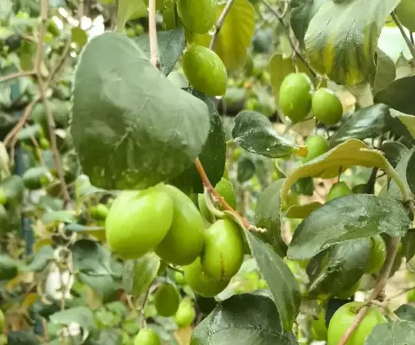 滇刺枣(学名:Ziziphus mauritiana Lam.)是鼠李科枣属植物,常绿乔木或灌木,高达15米;幼枝被黄灰色密绒毛,小枝被短柔毛,老枝紫红色。叶纸质至厚纸质,卵形、矩圆状椭圆形,稀近圆形。花绿黄色,两性,5基数,数个或10余个密集成近无总花梗或具短总花梗的腋生二歧聚伞花序。核果矩圆形或球形,橙色或红色,成熟时变黑色,基部有宿存的萼筒;果梗长5-8毫米,被短柔毛;种子宽而扁,红褐色,有光泽。花期8-11月,果期9-12月。