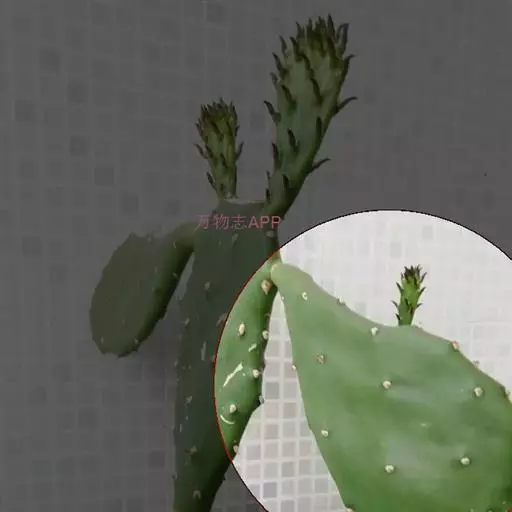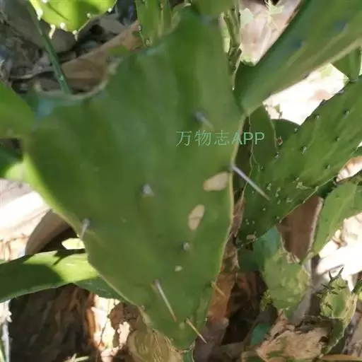 丛生肉质灌木,高(1-)1.5-3米。上部分枝宽倒卵形、倒卵状椭圆形或近圆形,长10-35(-40)厘米,宽7.5-20(-25)厘米,厚达1.2-2厘米,先端圆形,边缘通常不规则波状,基部楔形或渐狭,绿色至蓝绿色,无毛;小窠疏生,直径0.2-0.9厘米,明显突出,成长后刺常增粗并增多,每小窠具(1-)3-10(-20)根刺,密生短绵毛和倒刺刚毛;刺黄色,有淡褐色横纹,粗钻形,多少开展并内弯,基部扁,坚硬,长1.2-4(-6)厘米,宽1-1.5毫米;倒刺刚毛暗褐色,长2-5毫米,直立,多少宿存;短绵毛灰色,短于倒刺刚毛,宿存。叶钻形,长4-6毫米,绿色,早落。