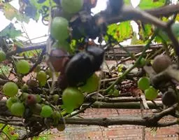 危害红提葡萄的虫害有蟋蟀和白星花金龟。蟋蟀喜欢破坏葡萄的萌芽,使得葡萄无法结出果实。药物为辛硫磷、敌百虫等,使用方法为200g辛硫磷加5kg麸皮加水拌匀,葡萄出土后均匀地撒施于田间,可以有效地杀灭蟋蟀。在此期间,不要将田间杂草清除,因为蟋蟀在有杂草吃的情况下,可以极大地减轻对葡萄芽体的危害。进行投毒防治,在蟋蟀对葡萄没有危害的时候再次进行除草。之后,对田间进行旋耕,以提高地温,促进根系快速发育生长。白星花金龟主要是对葡萄粒进行危害,其对于成熟的葡萄粒危害特别大,在防治的过程中,通过悬挂糖醋瓶进行诱杀。