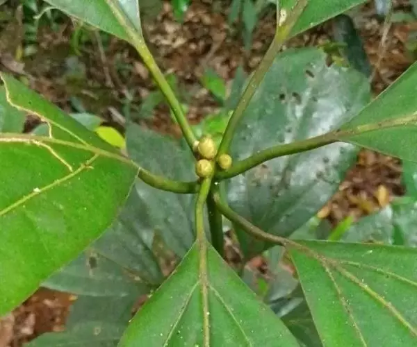 伞形花序簇生叶腋或枝侧,无总梗;每一花序有花5朵;花梗长3-6毫米,密被长柔毛;花被裂片4,椭圆形,外面密被长柔毛,内面基部有长柔毛;雄花:能育雄蕊6,花丝基部有长柔毛,第三轮基部腺体肾形,有柄;具退化雌蕊;雌花:退化雄蕊基部有长柔毛;子房卵圆形.无毛,花柱稍长,柱头扁平。果球形,径约1.3厘米;果托浅盘状;果梗粗壮,长4-6毫米,有柔毛。花期9-10月,果期翌年1-2月。