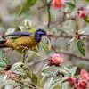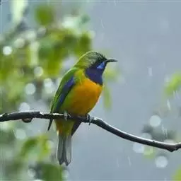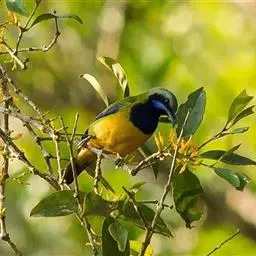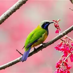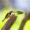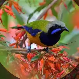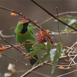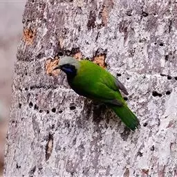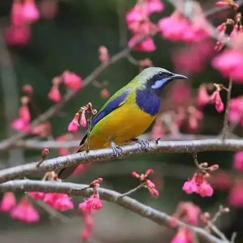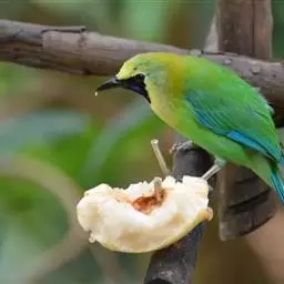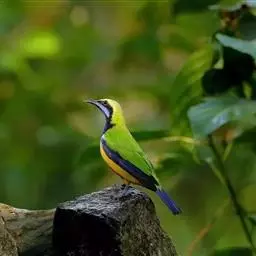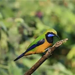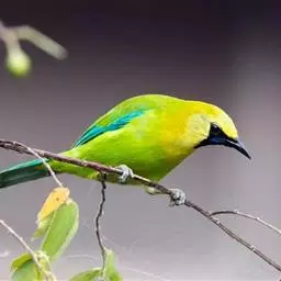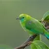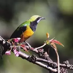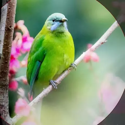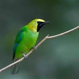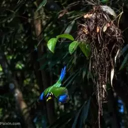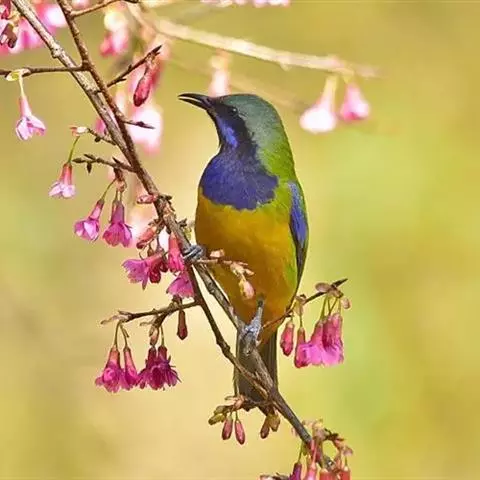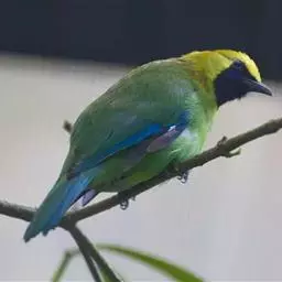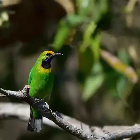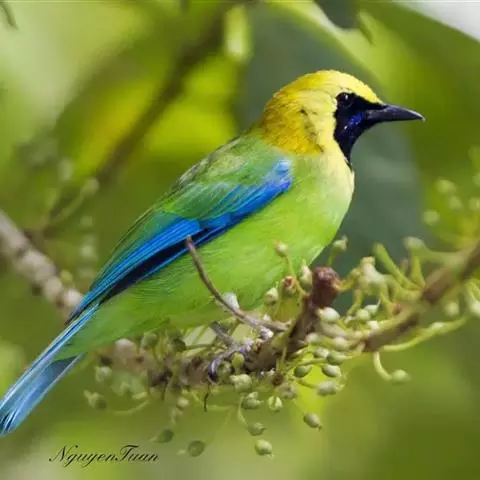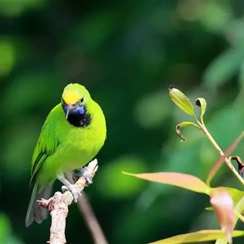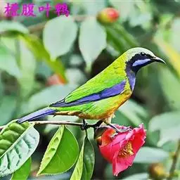 蓝翅叶鹎:小型鸟类,体长15-18厘米。雄鸟通体草绿色,尾蓝绿色,肩和翅亮蓝 色,胸缀有黄色,…