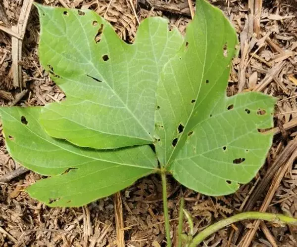 叶互生,多数为琴形,长3.5-5.5厘米,宽2.5-4.8厘米,基部常3-5深裂,裂片全缘,侧裂片愈近基部的愈小,端钝,中裂片较大,通常卵形,先端渐尖,两面均被白色发亮的长柔毛,中脉明显,侧脉在下面较清晰,通常每边5-7条;少数在小枝上部的为心脏形,小,长约1-2厘米;叶柄长约1-3厘米,被有与茎枝相同的毛被。