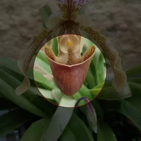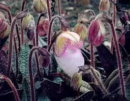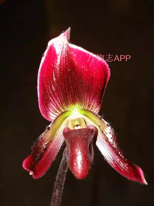 花葶直立,长12-23厘米,紫色,密被短柔毛,顶端生1花;花苞片卵状披针形,围抱子房,长1.6-2.4厘米,宽约1厘米,背面被柔毛,边缘具长缘毛;花梗和子房长3-6厘米,密被短柔毛;花直径7-8厘米;中萼片白色而有紫色或紫红色粗脉纹,合萼片淡绿色而有深色脉,花瓣紫红色或浅栗色而有深色纵脉纹、绿白色晕和黑色疣点,唇瓣紫褐色或淡栗色,退化雄蕊色泽略浅于唇瓣并有淡黄绿色晕;中萼片卵状心形,长与宽各为2.5-4厘米,先端短渐尖,边缘外弯并疏生缘毛,背面被短柔毛;合萼片卵形或卵状披针形,长2-2.8厘米,宽9-13毫米,先端渐尖,背面被短柔毛,边缘具缘毛;花瓣近长圆形,长3.5-5厘米,宽1-1.6厘米,先端渐尖,上面仅有疣点而通常无毛,边缘有缘毛;唇瓣倒盔状,基部具宽阔的、长1.5-1.7厘米的柄;囊近宽长圆状卵形,向末略变狭,长2-3厘米,宽2.5-2.8厘米,囊口极宽阔,两侧各具1个直立的耳,两耳前方的边缘不内折,囊底有毛,囊外被小乳突;退化雄蕊肾状半月形或倒心状半月形,长约8毫米,宽约1厘米,先端有明显凹缺,凹缺中有1-3个小齿,上面有极微小的乳突状毛。花期10月至次年1月。 [2-3]