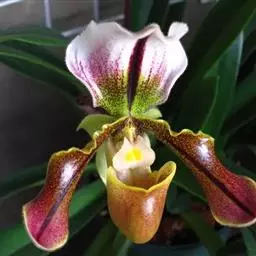紫纹兜兰 地生或半附生植物。叶基生,二列,3-8枚;叶片狭椭圆形或长圆状椭圆形,长7-18厘米,宽2.3-4.2厘米,先端近急尖并有2-3个小齿,上面具暗绿色与浅黄绿色相间的网格斑,背面浅绿色,基部收狭成叶柄状并对折而互相套叠,边缘略有缘毛。