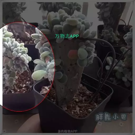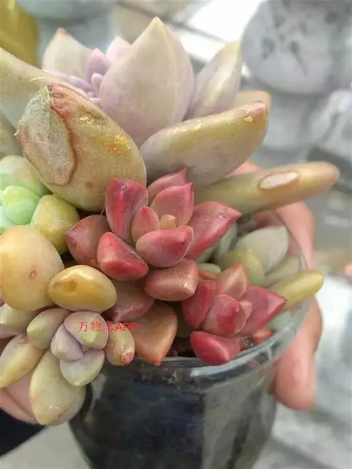 另外,在同样光照充足的养护条件下,桃之卵的叶片颜色比桃美人鲜艳。桃之卵成体的叶片比桃美人成体的更小且偏圆。此外,桃美人的叶片先端有时具凸起的小尖,而桃之卵则不会出现这种情况。