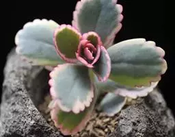 叶卵形至球形,长约3~4 cm, 厚约10~18 mm,灰绿色,在温差大、日照时间长的环境下呈现粉色,有霜粉。