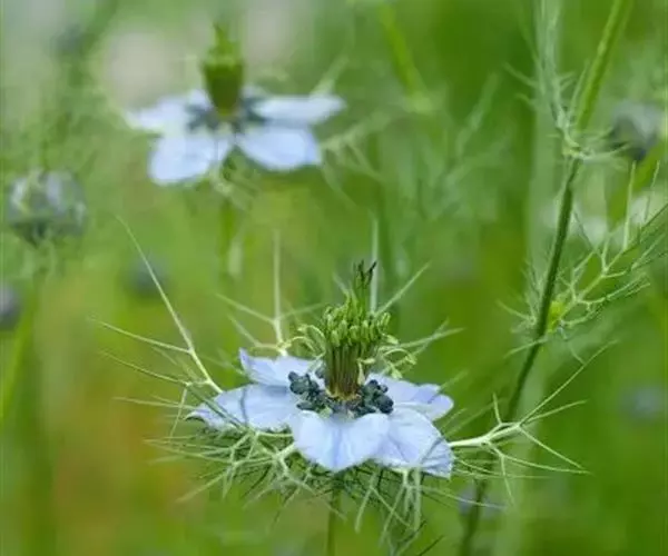 黑种草(学名:Nigella damascena L.)是毛茛科,黑种草属一年生草本,高可达60厘米。茎有疏短毛,中上部多分枝。叶为一回或二回羽状深裂,裂片细,茎下部的叶有柄,花单生枝顶,花萼淡蓝色,形如花瓣,椭圆状卵形,二唇形,雄蕊多数,花药处部钝或微渐尖;果膨胀,基部合生几达中部而形成蒴果,种子多数,扁三棱形,黑色,6-7月开花,8月结果。