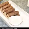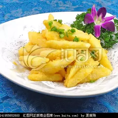 4、将经浸泡的山药条按照自己喜欢的方式摆在盘中,用适量得蓝莓酱淋在山药条上即可。