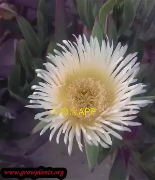 一年生或二年生草本。茎匍匐,长30-60厘米。叶互生,叶片扁平, 冰叶日中花 带肉质,卵形或长匙形,长15厘米,宽7.5厘米,基部几心形,紧抱茎,边缘波状, 叶表覆有包含盐分的透明液体的隆起, 下部叶有柄。