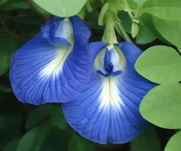 花大,单朵腋生;苞片2,披针形;小苞片大,膜质,近圆形,绿色,直径5-8毫米,有明显的网脉;花萼膜质,长1.5-2厘米,有纵脉,5裂,裂片披针形,长不及萼管的1/2;先端具凸尖;花冠蓝色、粉红色或白色,长可达5.5厘米,旗瓣宽倒卵形,直径约3厘米,中央有一白色或橙黄色浅晕,基部渐狭,具短瓣柄,翼瓣与龙骨瓣远较旗瓣为小,均具柄,翼瓣倒卵状长圆形,龙骨瓣椭圆形;雄蕊二体;子房被短柔毛。荚果长5-11厘米,宽约1厘米,扁平,具长喙,有种子6-10颗;种子长圆形,长约6毫米,宽约4毫米,黑色,具明显种阜。花、果期7-11月。