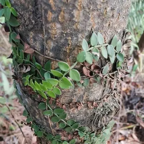 蔓九节是茜草科九节属的攀援或匍匐藤本植物。常以气根攀附树干或岩石;幼枝无毛或有粃糠状柔毛;幼树叶卵形或倒卵形,托叶膜质;圆锥状或伞房状聚伞花序顶生,苞片和小苞片线状披针形,花萼倒圆锥形,花冠白色,冠筒与裂片近等长,裂片长圆形;浆果状核果球形或椭圆形;花期4-6月;果期全年。因叶片紧贴着树干往上生长,宛如一条青龙上树,故又名“上树龙”。蔓九节分布在中国浙江、福建、台湾等省地,在日本、朝鲜、越南等国也有分布,生长在海拔70-1360米的平地、丘陵、山地、山谷水旁的灌丛或林中。喜温暖湿润,不耐寒,耐荫,适宜选用排水良好、富含有机质的砂质土壤。蔓九节在《世界自然保护联盟濒危物种红色名录》中属于无危。繁殖方法一般为扦插、压条、播种繁殖。据《福建药物志》中记载蔓九节“有祛风除湿,舒筋活络的功效。主治风湿关节痛,头风痛,手足麻木坐骨神经痛,腰肌劳损,