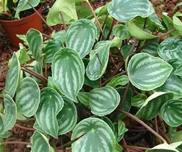 多年常绿草木,株高约15-20厘米。根茎顶端从生状抽生长长的叶柄,红褐色的叶柄上端着生单叶。叶片卵圆形至心脏形,向叶柄内反卷成半圆形,主宽脉八条,由中央向四周呈辐射状延伸,宽脉绿色,脉间银白色,叶形和色泽颇似西瓜。穗状花序,花小,白色。 西瓜皮椒草