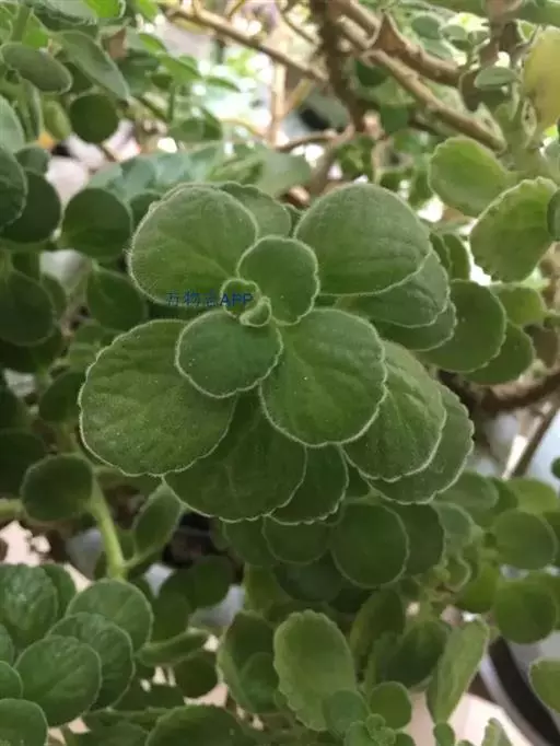 亚灌木状多年生草本植物。多分枝,全株被有细密的白色绒毛。肉质叶,交互对生,绿色,卵圆形,边缘有钝锯齿。茎细瘦,匍匐状,分枝多,叶圆形,叶片毛茸茸,花小,白色。因触碰后可散发出令人舒适的香气而享有“碰碰香”的美称。又因其香味浓甜,颇似苹果香味,故又享有“苹果香”美誉。闻之令人神清气爽。