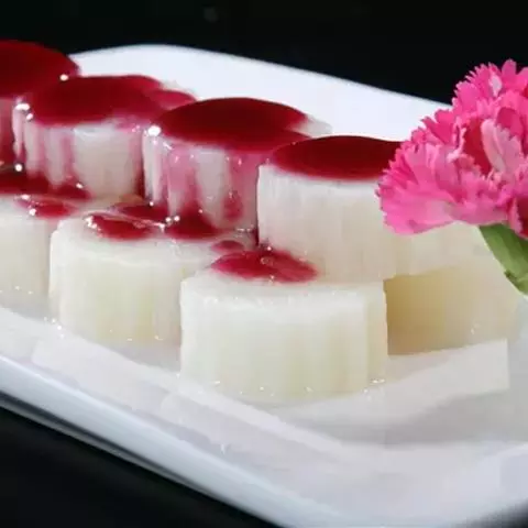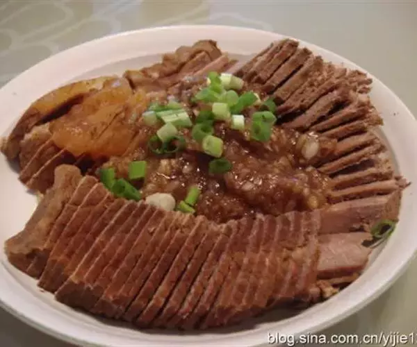 4、出品时将豆腐切片垫底,鹅胗、肝切片,鹅掌、翼修斩成小段,鹅身去骨片肉,分别摆进拼盘中。烧热卤水汁,淋在菜肴上,随手将卤水汁倒出,即可上桌。