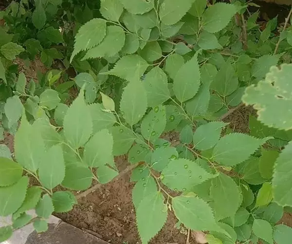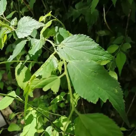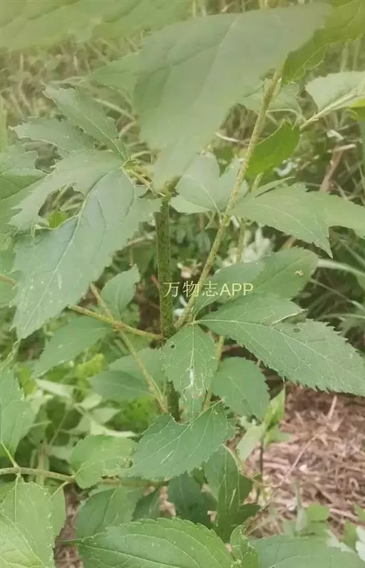 叶纸质,宽卵形至长卵形,长3-10厘米,宽2-5厘米,先端渐尖至尾状渐尖,基部不对称,楔形、圆形或截形,边缘有不整齐的锯齿,基部3出脉,侧出的一对近直伸达叶的上部,侧脉4-6对,叶面绿,幼时被短硬毛,后脱落常残留有圆点,光滑或稍粗糙,叶背淡绿,在脉上有稀疏的或较密的短柔毛,脉腋有簇毛,其余近光滑无毛;叶柄长5-15毫米,被短柔毛。