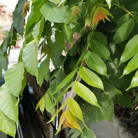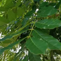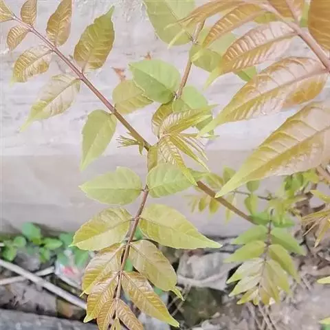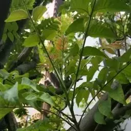 叶为2-3回奇数羽状复叶,长20-40厘米;小叶对生,卵形、椭圆形至披针形,顶生一片通常略大,长3-7厘米,宽2-3厘米,先端短渐尖,基部楔形或宽楔形,多少偏斜,边缘有钝锯齿,幼时被星状毛,后两面均无毛,侧脉每边12-16条,广展,向上斜举。