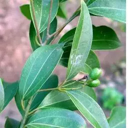 七、红蜡蚧:该虫为香樟树的次要刺吸类益虫。若虫初为淡白色,较扁平,背面部隆起,构成星状白色物质;雌成虫呈椭圆形,具暗白色蜡壳。以雌成虫和若虫群栖于香樟芽梢、枝梢及新叶上,吮吸植株汁液。香樟受害后新梢停止抽发,渐至叶落枯枝,重者香樟全株殒命。
