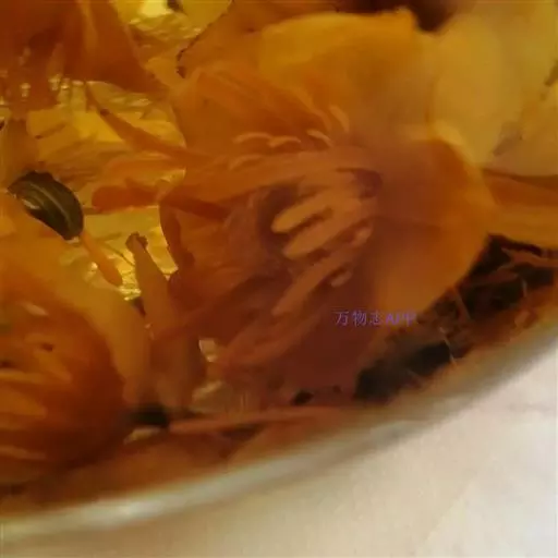 (2)宽瓣金莲花 花皱缩,湿润展平后,直径2.5-4.8cm;萼片10-20,橙黄色,宽椭圆形或倒卵形,长1-2.2cm,宽0.6-1.7cm,全缘或先端有不整齐小齿;花瓣18-22棕色,匙状线形,与萼片等长或稍短;雄蕊多数;于房多数,聚合,花柱短尖。气微,味苦。