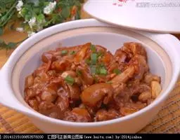 5、放入茶树菇,拌匀后继续加盖焖10分钟,直到茶树菇软烂。肉块酥烂时,转成大火将剩余汤汁收干即可。