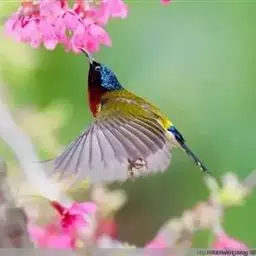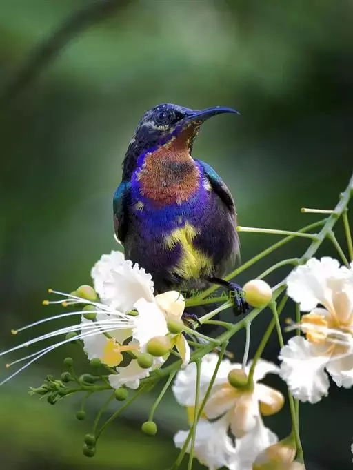 叉尾太阳鸟,雀形目太阳鸟科太阳鸟属留鸟;为小型鸟类,雄鸟头顶辉蓝绿色,上体橄榄绿色,腰明黄色,…