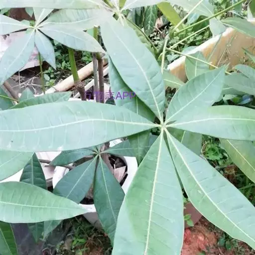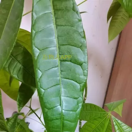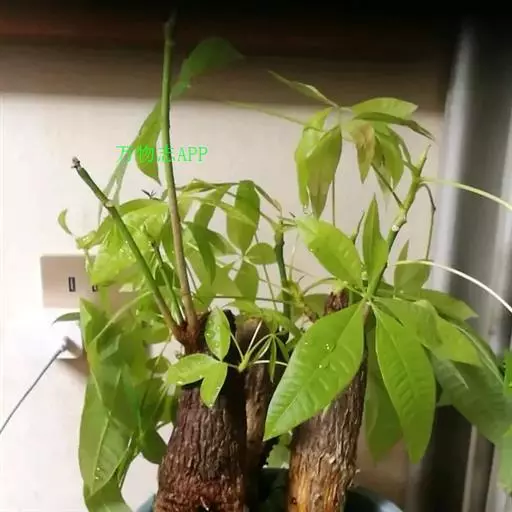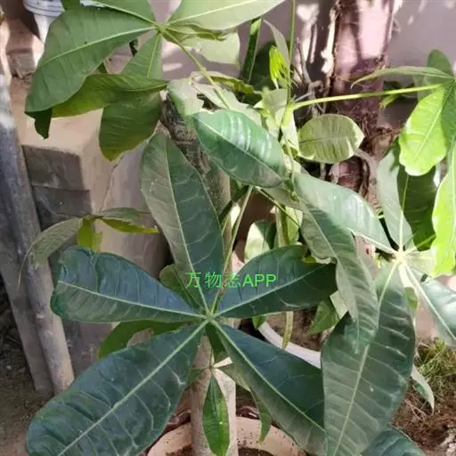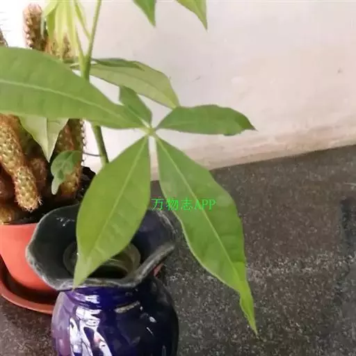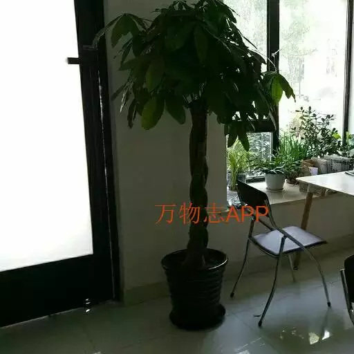 瓜栗(学名:Pachira macrocarpa (Cham. et Schlecht.) Walp. ),俗称发财树,木棉科小乔木,高4-5米,树冠较松散,幼枝栗褐色,无毛。小叶具短柄或近无柄。花单生枝顶叶腋;花梗粗壮,被黄色星状茸毛,脱落;萼杯状,近革质;花瓣淡黄绿色,狭披针形至线形,上半部反卷;雄蕊管较短,花丝连雄蕊管长13-15厘米,下部黄色,向上变红色,花药狭线形,弧曲;花柱长于雄蕊,深红色。蒴果近梨形,果皮厚,木质,几黄褐色,外面无毛,内面密被长绵毛,开裂,每室种子多数。种子大,不规则的梯状楔形,表皮暗褐色,有白色螺纹,内含多胚。花期5-11月,果先后成熟,种子落地后自然萌发。