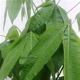 小叶5-11,具短柄或近无柄,长圆形至倒卵状长圆形,渐尖,基部楔形,全缘,上面无毛,背面及叶柄被锈色星状茸毛;中央小叶长13-24厘米,宽4.5-8厘米,外侧小叶渐小;中肋表面平坦,背面强烈隆起,侧脉16-20对,几平伸,至边缘附近连结为一圈波状集合脉,其间网脉细密,均于背面隆起;叶柄长11-15厘米。