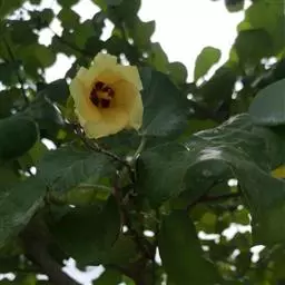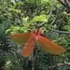 花单生枝顶叶腋;花梗粗壮,长2厘米,被黄色星状茸毛,脱落;萼杯状,近革质,高1.5厘米,直径1.3厘米,疏被星状柔毛,内面无毛,截平或具3-6枚不明显的浅齿,宿存,基部有2-3枚圆形腺体;花瓣淡黄绿色,狭披针形至线形,长达15厘米,上半部反卷;雄蕊管较短,分裂为多数雄蕊束,每束再分裂为7-10枚细长的花丝,花丝连雄蕊管长13-15厘米,下部黄色,向上变红色,花药狭线形,弧曲,长2-3毫米,横生;花柱长于雄蕊,深红色,柱头小,5浅裂。