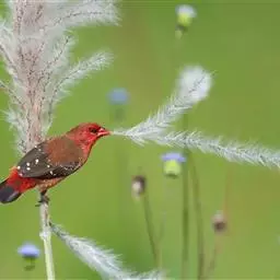 红梅花雀小型鸟类,体长9-10厘米。雄鸟通体朱红色,背、肩、胸等满布白色小斑点,…