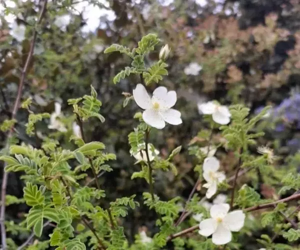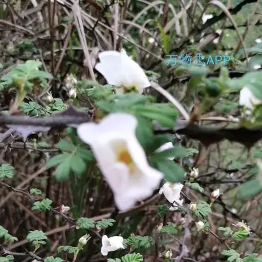 银露梅(学名:Potentilla glabra Lodd.)是蔷薇科,委陵菜属灌木,高可达2米,树皮纵向剥落。小枝红褐色,羽状复叶,叶柄被绢毛或疏柔毛;小叶片长圆形、倒卵长圆形或卵状披针形,两面绿色,托叶薄膜质,单花或数朵生于枝顶,花梗密被长柔毛或绢毛;萼片卵圆形,顶端急尖至短渐尖,花瓣白色,宽倒卵形,顶端圆钝,比萼片长;花柱近基生,瘦果褐棕色近卵形,6-11月开花结果。