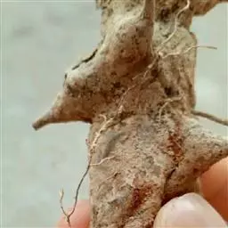 块根纺锤形或团块状,一般略弯曲。长5-15cm,直径4-10cm。表 面红棕色或红褐色,凹凸不平,有不规则的纵沟和致密皱纹,并有横长皮孔及细根痕。