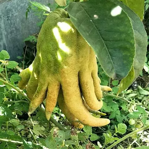 柑果卵形或矩圆形,长10~25厘米,顶端分裂如拳,或张开如指,外皮鲜黄色,有乳状突起,无肉瓤与种子。