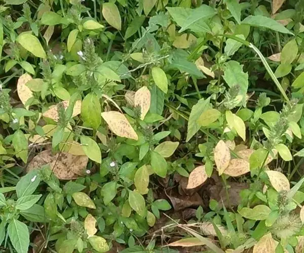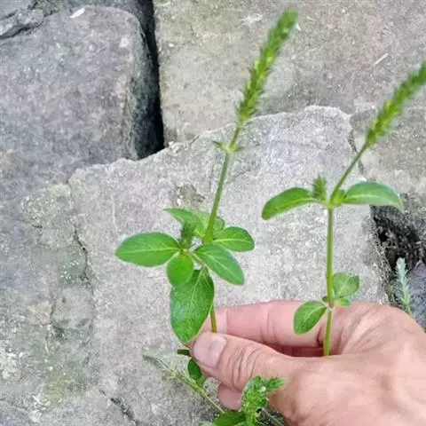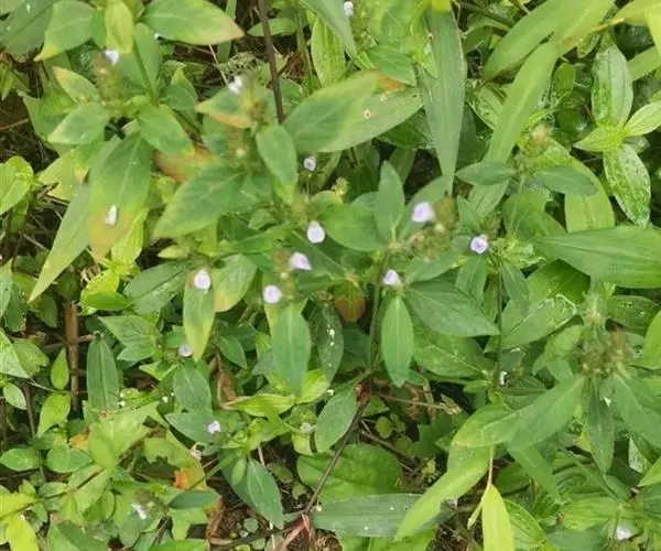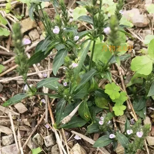 全草长10~60cm。根细而弯曲。茎具纵棱,直径2~4mm,基部节上常有不定根;表面黄绿色;被毛,节膨大成膝状;质脆,易折断,断面可见白色的髓。叶对生,具柄;叶片多皱缩,展平后呈卵形或狼状披针形,两面及叶缘有毛。穗状花序顶生或腋生、苞片及宿存花萼均被粗毛;偶见花冠,淡红色。蒴果棒状,长约6mm。种子4颗,黑褐色,扁三角形。气微,味淡。以茎叶色绿者为佳。