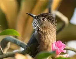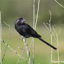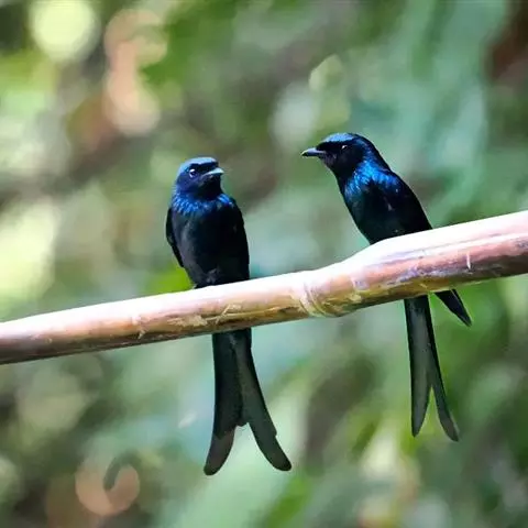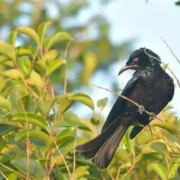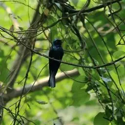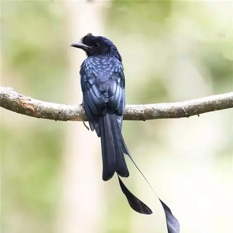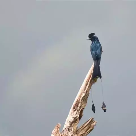 发冠卷尾是中型鸟类,体长28-35厘米。通体绒黑色缀蓝绿色金属光泽,额部具发丝状羽冠,…