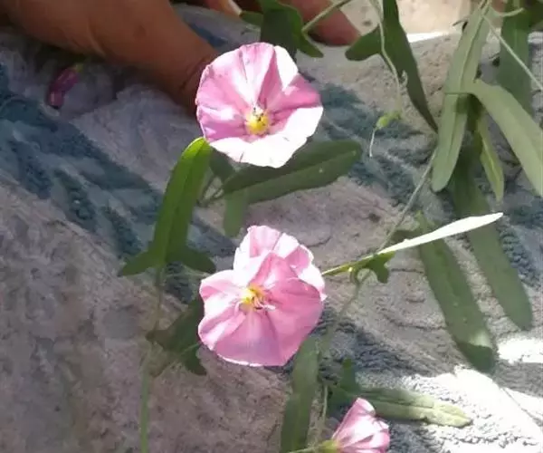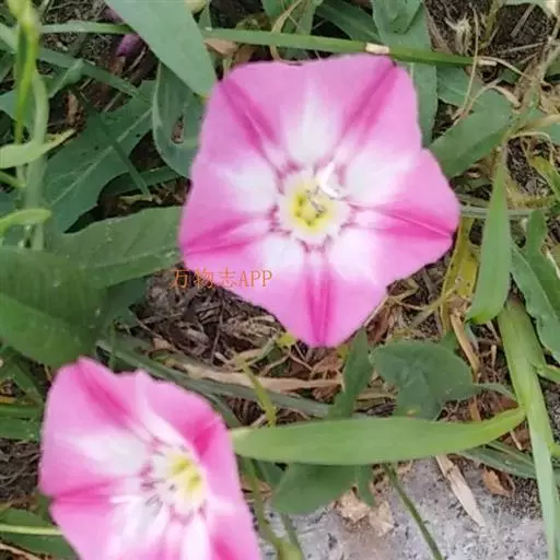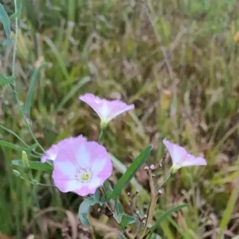 田旋花,多年生草质藤本,近无毛。根状茎横走。茎平卧或缠绕,有棱。叶柄长1~2厘米;叶片戟形或箭形,长2.5~6厘米,宽1~3.5厘米,全缘或3裂,先端近圆或微尖,有小突尖头;中裂片卵状椭圆形 、狭三角形、披针状椭圆形或线性;侧裂片开展或呈耳形。花1~3朵腋生;花梗细弱;苞片线性,与萼远离;萼片倒卵状圆形,无毛或被疏毛;缘膜质;花冠漏斗形,粉红色、白色,长约2厘米,外面有柔毛,褶上无毛,有不明显的5浅裂;雄蕊的花丝基部肿大,有小鳞毛;子房2室,有毛,柱头2,狭长。蒴果球形或圆锥状,无毛;种子椭圆形,无毛。花期5~8月,果期7~9月。